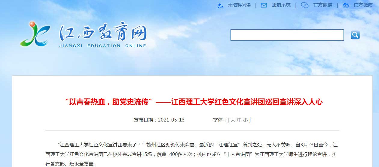 “江西理工大学红色文化宣讲团要来了!”赣州社区频频传来欢喜。最近的“江理红宣”所到之处,无人不赞叹。自3月23日至今,江西理工大学红色文化宣讲团已在校外完成宣讲15场,覆盖1400多人次;校内也成立“十人宣讲团”为江西理工大学师生进行理论宣讲,实行各支部、班级全覆盖。