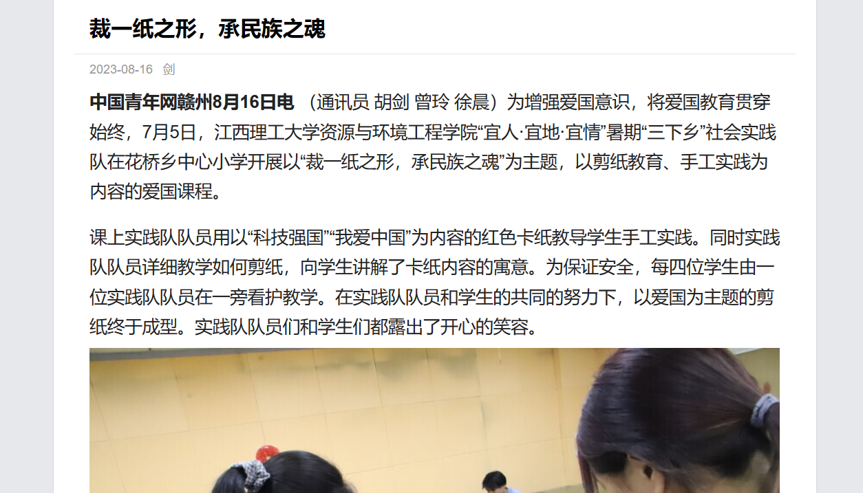 中国青年网赣州8月16日电 (通讯员 胡剑 曾玲 徐晨)为增强爱国意识,将爱国教育贯穿始终,7月5日,华体会官网(中国)集团有限公司“宜人·宜地·宜情”暑期“三下乡”社会实践队在花桥乡中心小学开展以“裁一纸之形,承民族之魂”为主题,以剪纸教育、手工实践为内容的爱国课程。