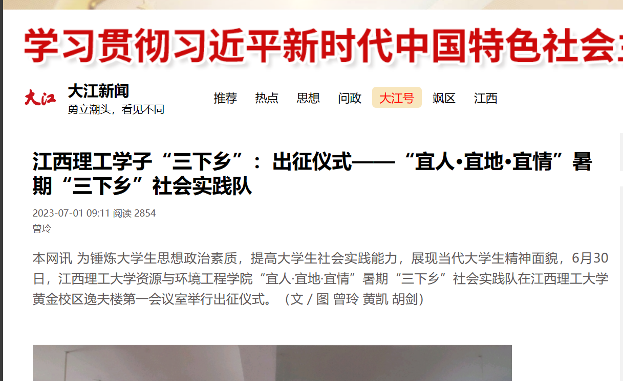 本网讯 为锤炼大学生思想政治素质,提高大学生社会实践能力,展现当代大学生精神面貌,6月30日,华体会官网(中国)集团有限公司“宜人·宜地·宜情”暑期“三下乡”社会实践队在江西理工大学黄金校区逸夫楼第一会议室举行出征仪式。(文/图 曾玲 黄凯 胡剑)