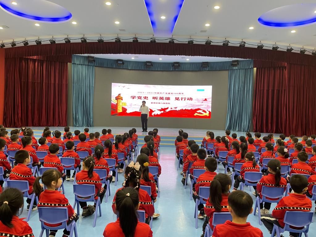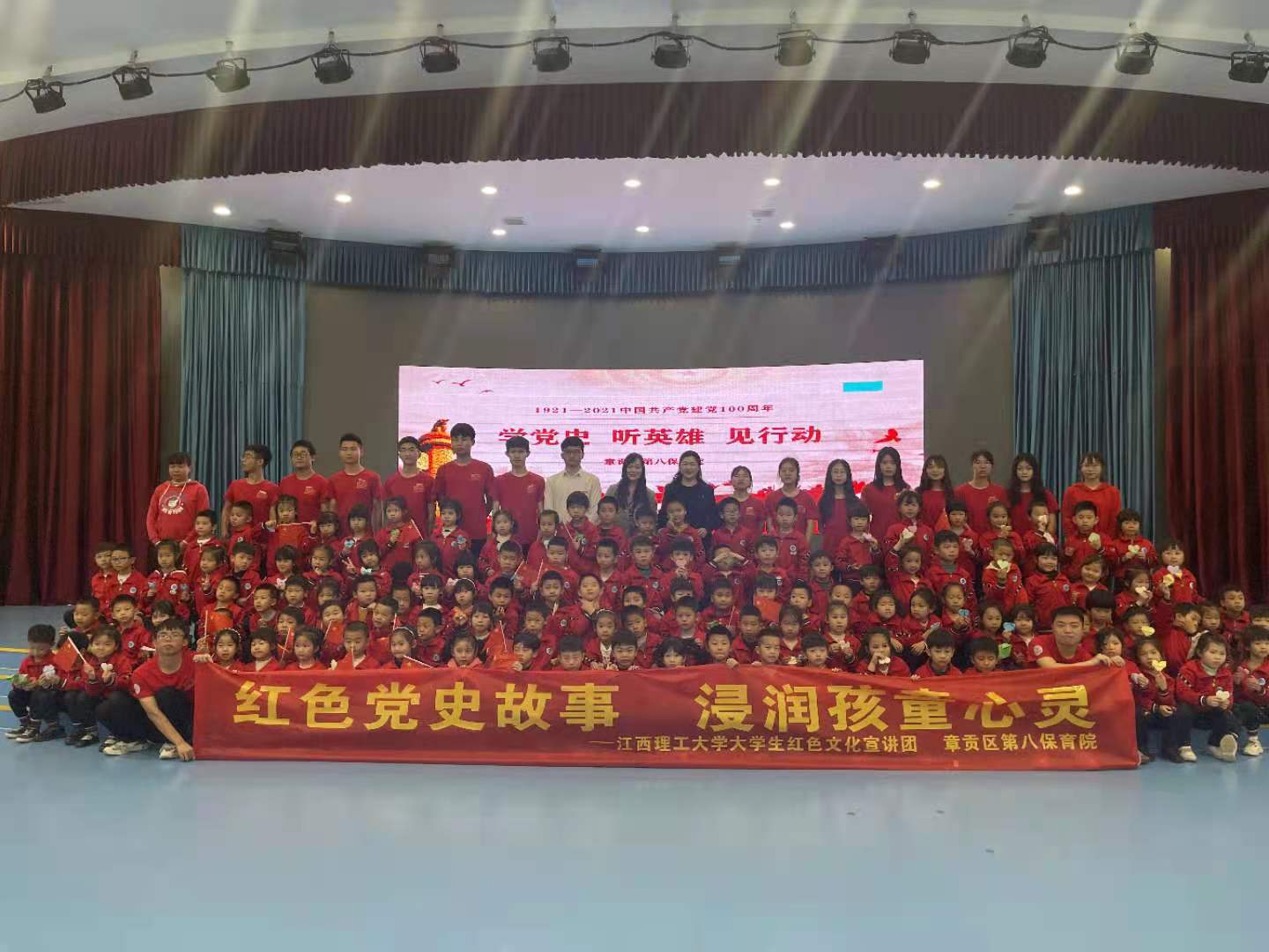 本网讯 4月19日,华体会官网(中国)集团有限公司大学生红色文化宣讲团和章贡区第八保育院一同开展了题为“红色党史故事,浸润孩童心灵”的党史宣讲活动。章贡区第八保育院院长王一红,华体会官网(中国)集团有限公司党建组织员赖华、大学生红色文化宣讲团指导老师张小普以及大学生红色文化宣讲团19名宣讲员一同进入章贡区第八保育院给小朋友们讲红色党史故事,传扬红色革命精神。