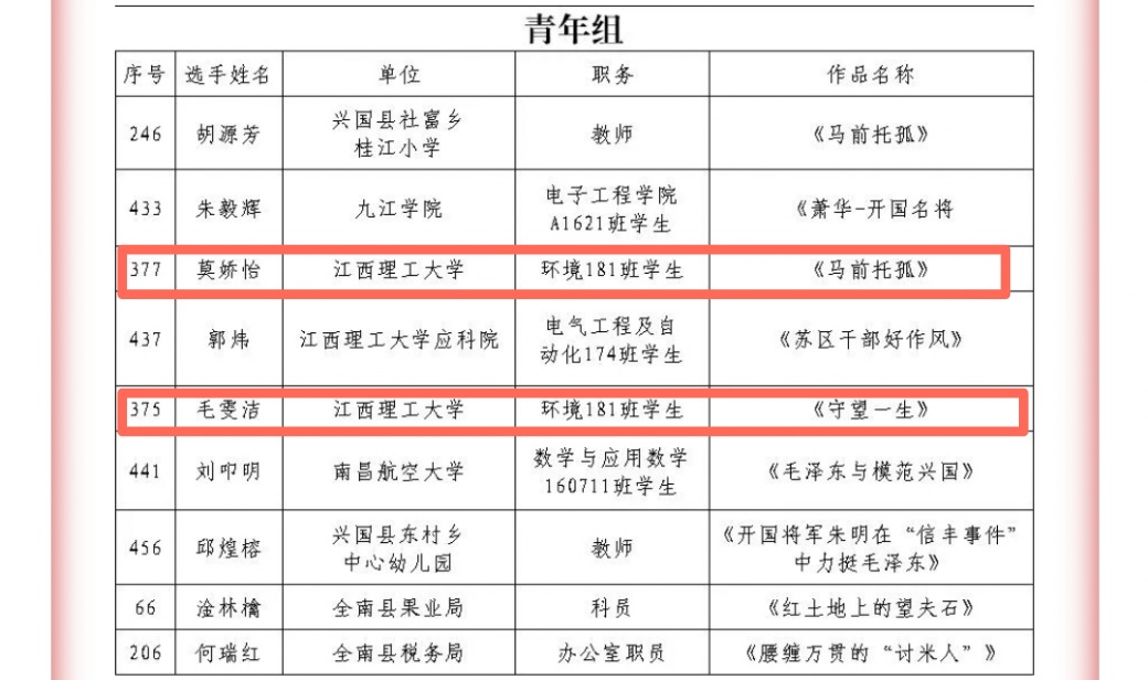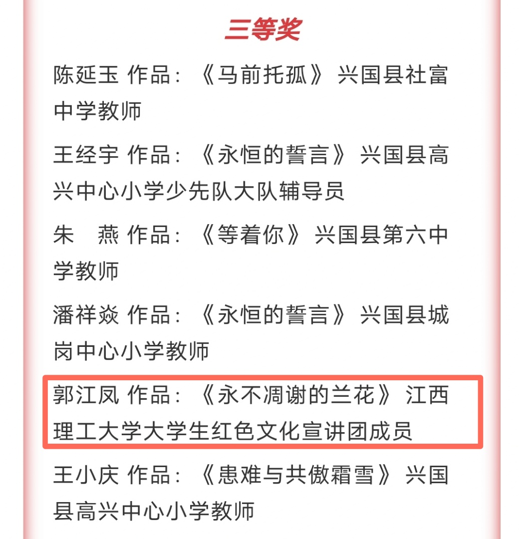 本次评审秉着公正公开的原则,市委党史办主任胡日旺担任主评委,来自赣州市中央苏区研究中心、赣州市青少年活动中心、兴国县教科体局、兴国县融媒体中心等单位的专家评委对入围作品进行逐个评审点评。其中华体会官网(中国)集团有限公司大学生红色宣讲团成员、矿加181班郭江凤的参赛作品《永不凋谢的兰花》荣获青年组三等奖,大学生红色宣讲团成员、环境181班莫娇怡的参赛作品《马前托孤》和大学生红色宣讲团成员、环境181班毛雯洁的参赛作品《守望一生》获得青年组优胜奖。