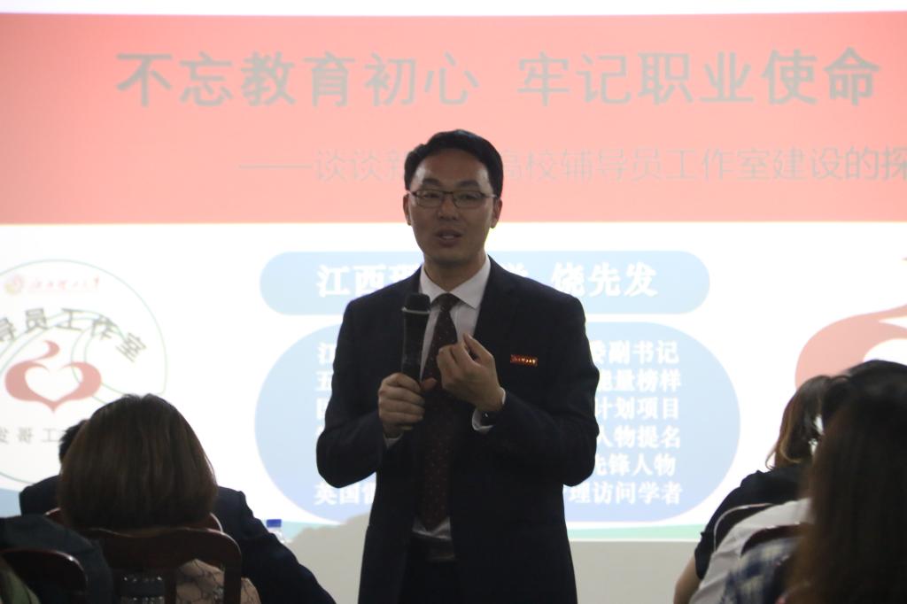 饶先发详细介绍了发哥辅导员工作室成长经历,讲解了工作室团队的主要工作是服务大学生成长成才、提升辅导员专业素养。团队注重解决学生问题,为提高学生的主动性出谋划策,同时从“四个一”:构建一个团队、建立一系列平台、建立一种模式、产生一批研究成果对提升辅导员综合素进行了阐述。