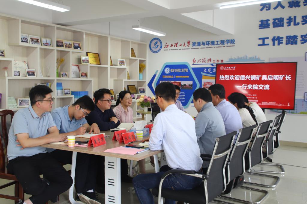 本网讯 5月8日,江铜集团德兴铜矿矿长吴启明、副矿长耿志强一行来院交流。华体会官网(中国)集团有限公司院长何桂春和相关专业负责人会见来宾并在黄金校区逸夫实验楼工作室召开座谈会。