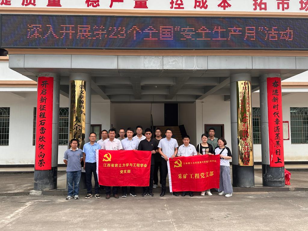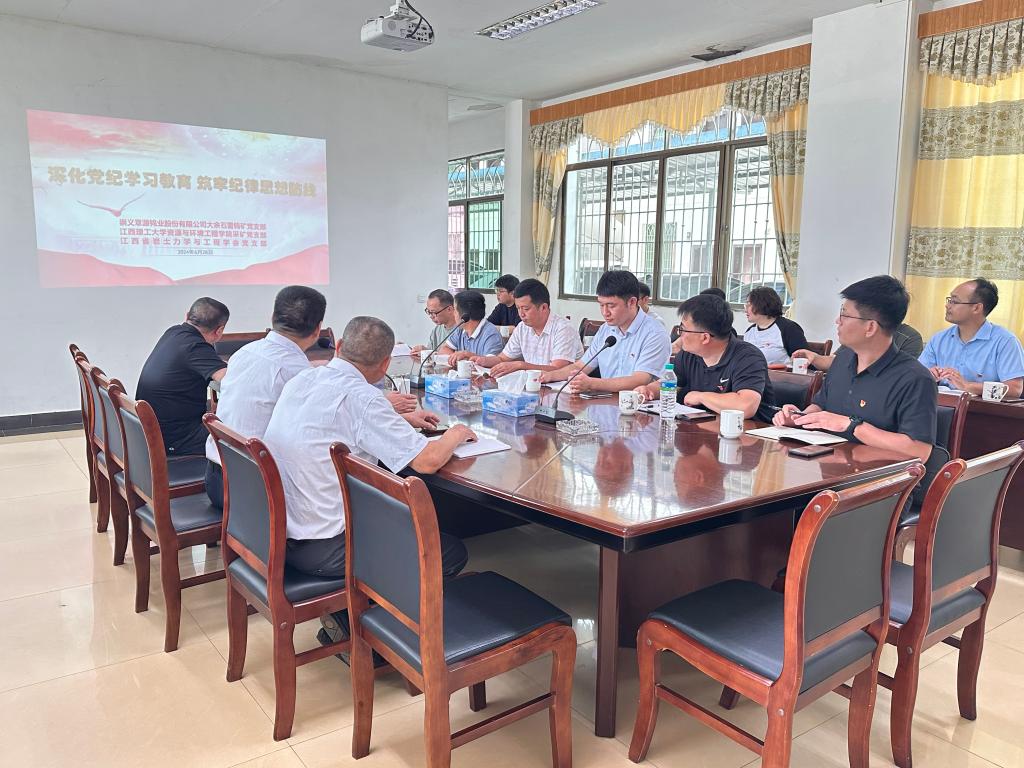 本网讯 6月28日,华体会官网(中国)集团有限公司采矿党支部赴崇义章源钨业股份有限公司大余石雷钨矿,与大余石雷钨矿党支部、江西省岩土力学与工程学会党支部共同开展“1+1+1”支部共建活动,进行了主题为“深化党纪学习教育筑牢纪律思想防线”的主题党日学习。大余石雷钨矿党支部书记黄上贵、矿长邱金铭,采矿党支部书记王石以及三个党支部党员参加了活动。