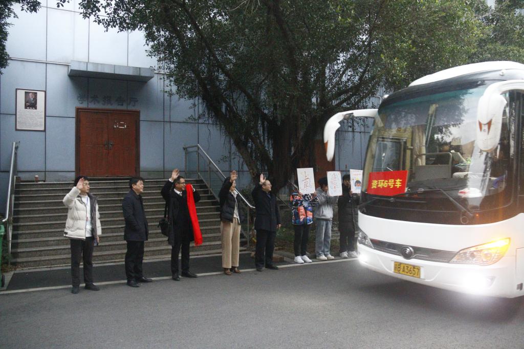 大巴车启动后,学院领导以及志愿者们站在路边,挥手送别考研学子,为他们献上自己最衷心的祝愿。