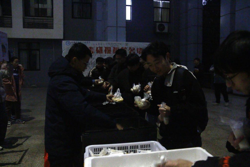 早上6:10考研专车就已经就位,学院的爱心早餐也同步送达。早餐种类丰富,包括粉丝包、包菜包、肉包、韭菜饼、蛋卷、馒头、面包、鸡蛋、豆奶等。“一定要吃饱,这样才有干劲迎接接下来的考试。”学院领导陆续为考研学子分发早餐,同时还不断叮嘱。