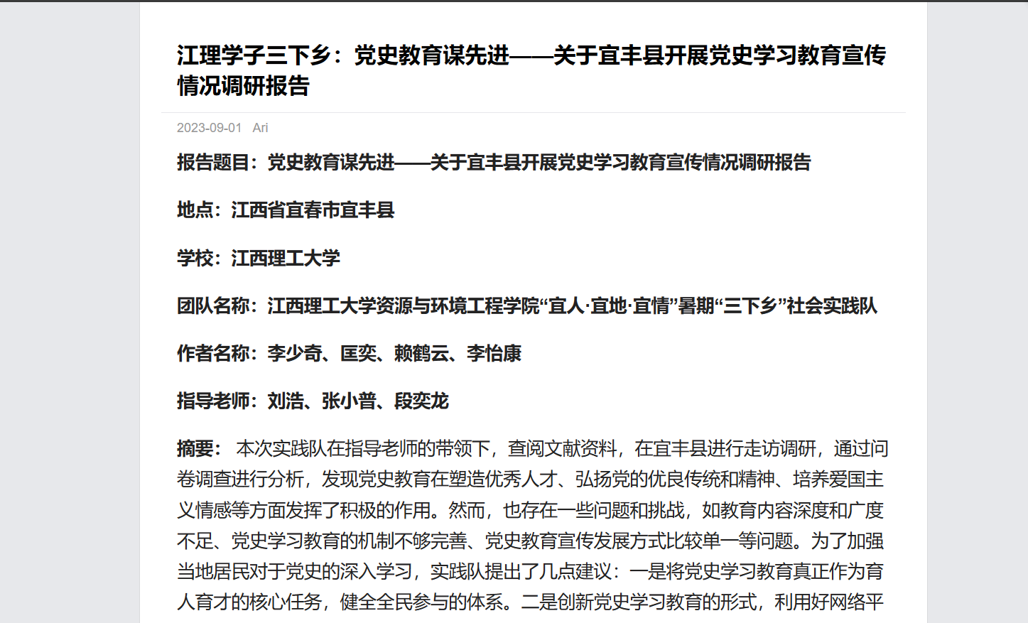 摘要: 本次实践队在指导老师的带领下,查阅文献资料,在宜丰县进行走访调研,通过问卷调查进行分析,发现党史教育在塑造优秀人才、弘扬党的优良传统和精神、培养爱国主义情感等方面发挥了积极的作用。然而,也存在一些问题和挑战,如教育内容深度和广度不足、党史学习教育的机制不够完善、党史教育宣传发展方式比较单一等问题。为了加强当地居民对于党史的深入学习,实践队提出了几点建议:一是将党史学习教育真正作为育人育才的核心任务,健全全民参与的体系。二是创新党史学习教育的形式,利用好网络平台,通过短视频的形式丰富多样的方式进行传播。三是加强趣味性,提高大家的学习兴趣。与此同时,实践队在当地为宣传党史的学习教育也做出了许多努力。我们拜访了当地的一些老党员,给小朋友们开展和红色文化相关的主题教育,并在宜丰县各地进行红色文化宣讲,获得了宜丰县委领导以及当地居民的肯定。