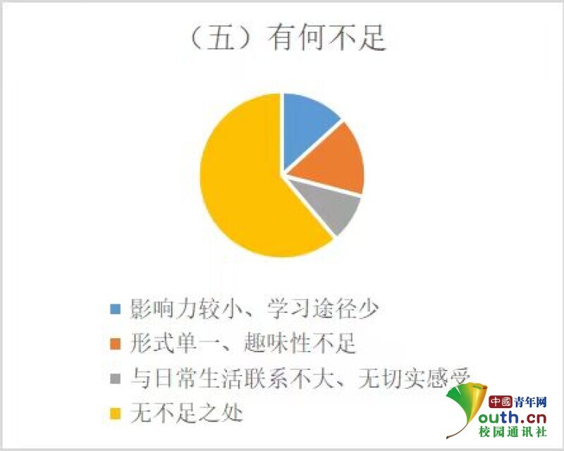 有26%的居民认为当地党史学习教育工作影响力小、学习途径少,有31%的居民认为活动形式单一、趣味性不足,而有19%的居民认为当地党史学习教育工作与日常生活联系不大、无切实感受,并有24%的居民认为并无不足之处。