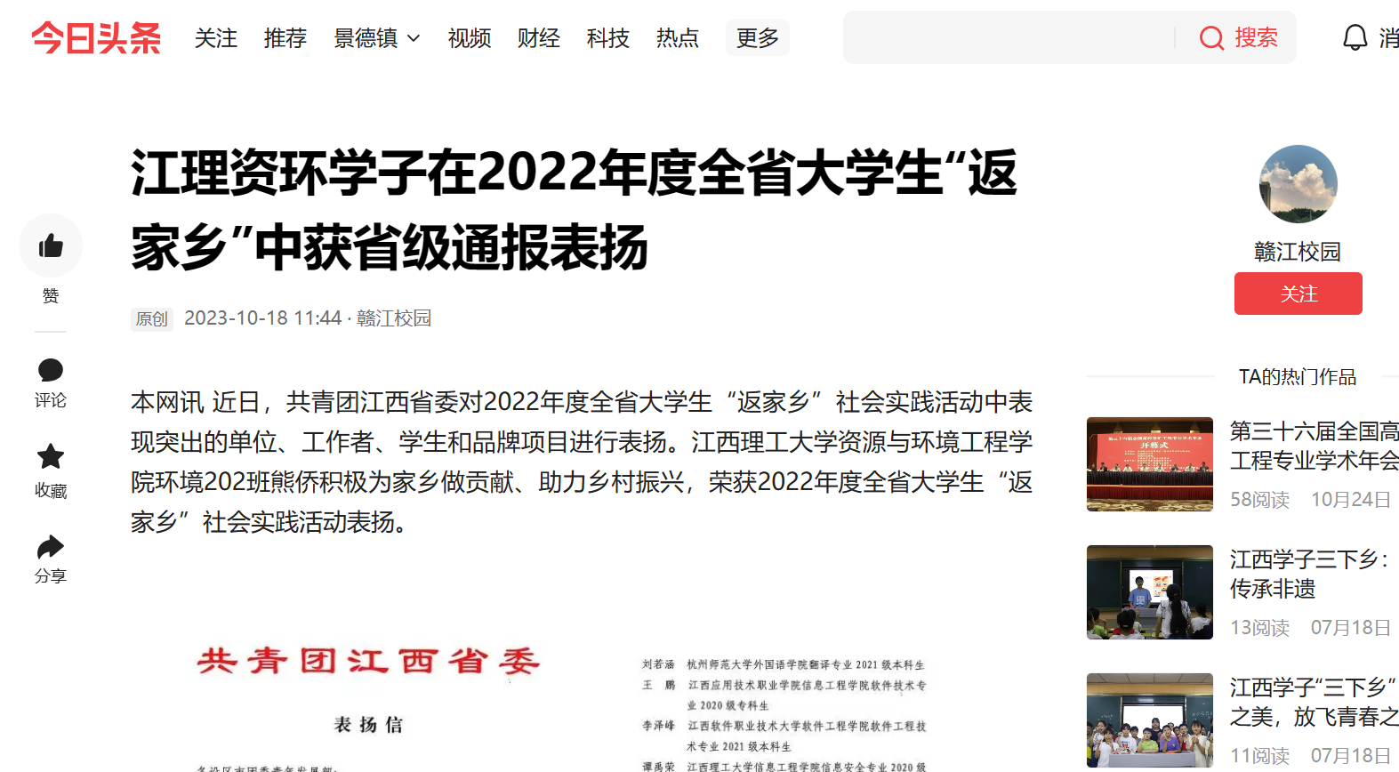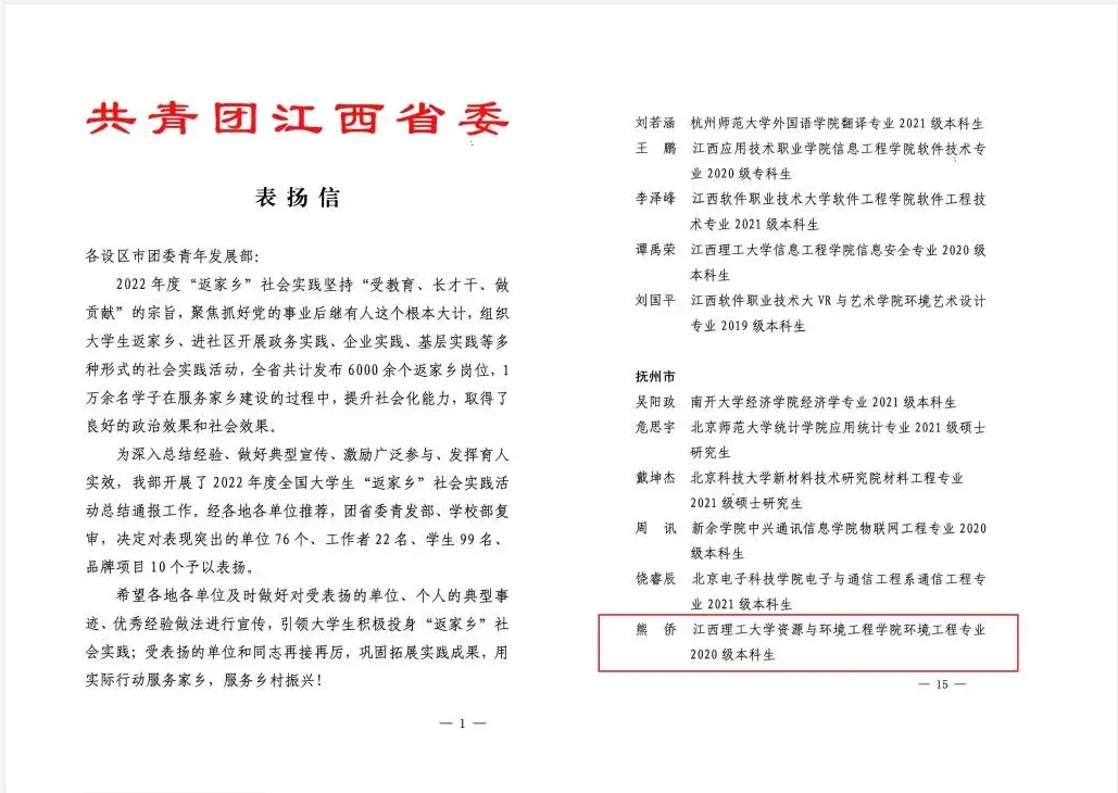 本网讯 近日,共青团江西省委对2022年度全省大学生“返家乡”社会实践活动中表现突出的单位、工作者、学生和品牌项目进行表扬。华体会官网(中国)集团有限公司环境202班熊侨积极为家乡做贡献、助力乡村振兴,荣获2022年度全省大学生“返家乡”社会实践活动表扬。