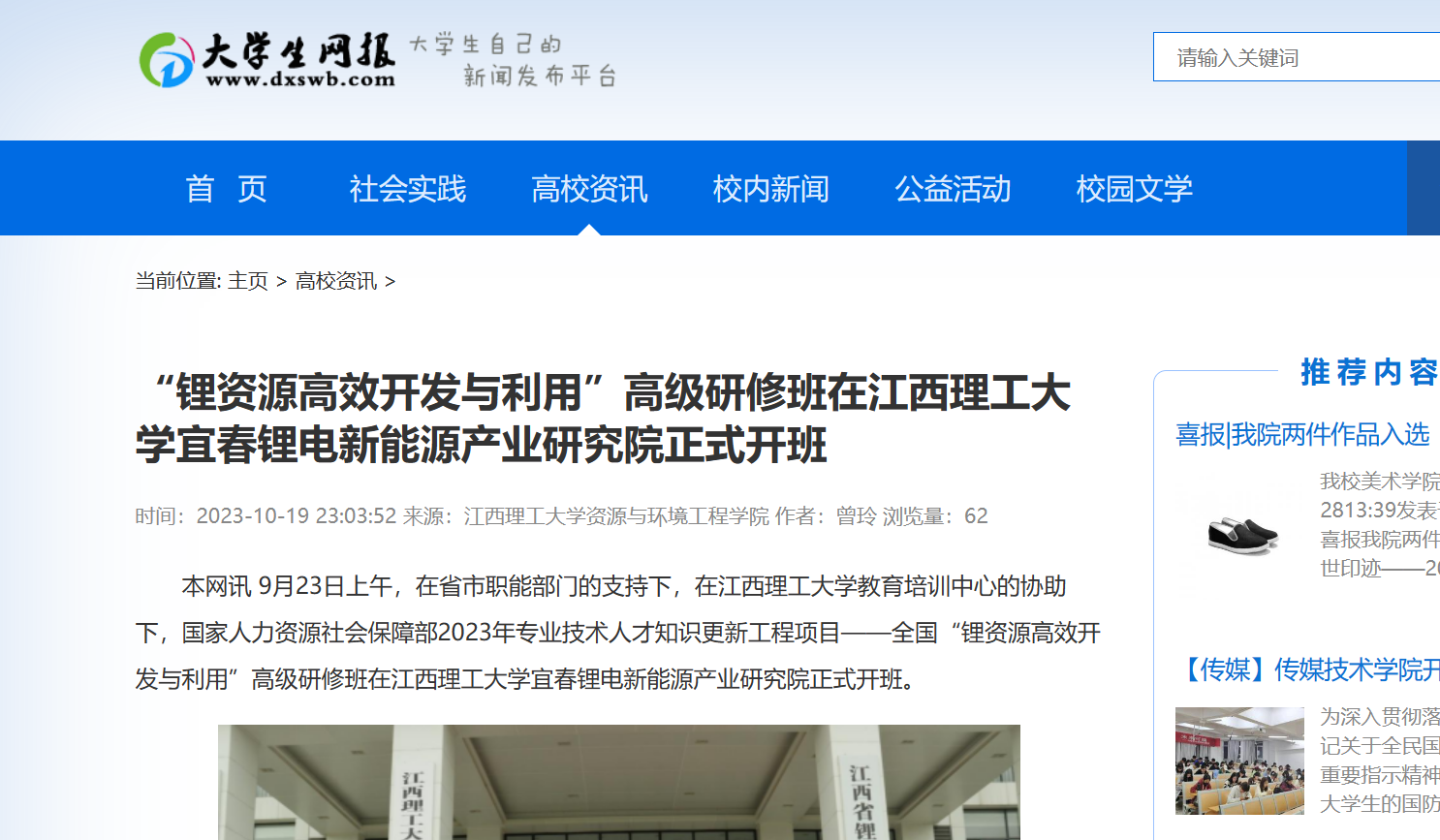 《大学生网报》:“锂资源高效开发与利用”高级研修班在江西理工大学宜春锂电新能源产业研究院正式开班