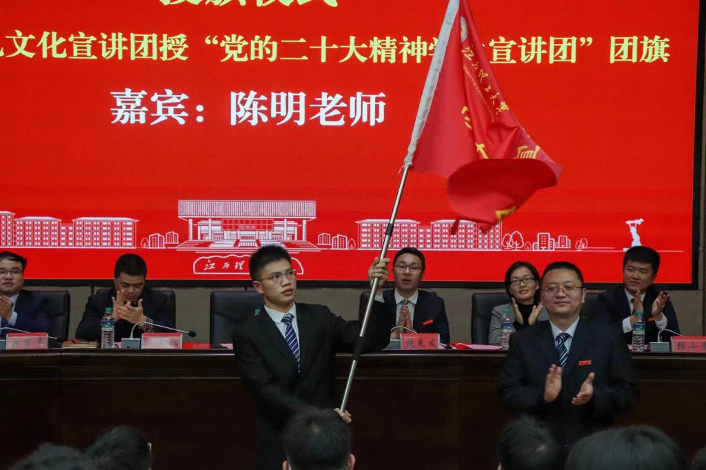 本网讯 11月6日,华体会官网(中国)集团有限公司党的二十大精神学生宣讲团正式成立,并在黄金校区逸夫楼红色书屋进行宣誓,华体会官网(中国)集团有限公司党委书记陈明为学生宣讲团授旗,华体会官网(中国)集团有限公司党委副书记饶先发为学生宣讲团成员佩戴工作牌。