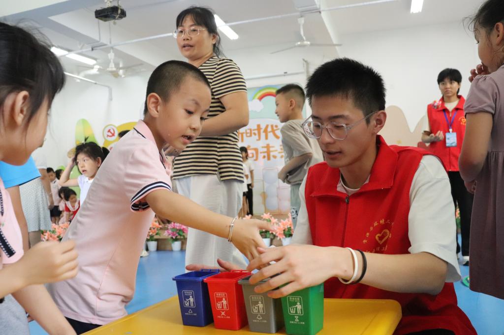 实践队其他成员还在活动室布置游戏场地,以“我是地球小保镖”自由绘画、“垃圾分类”认知pk赛、同伴互助赛等游戏使小朋友们更加清楚地记忆了垃圾分类等环保知识。