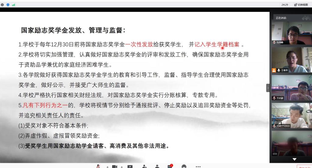 6月24日到6月29日,资环学院组织各班级开展关于“严肃工作纪律,认真做好学生奖助学金发放使用管理工作”的主题班会。班会上,班主任结合《江西省学生资助工作“十不准”(修订版)》和《江西理工大学国家奖学金评审实施办法》等文件,向学生解读学校的资助政策,让同学深切感受到国家对大学生的重视与关心,向学生强调奖助学金的使用规范,体现诚信资助的重要性,同时班主任也教导学生将感恩付诸行动,努力学习报效社会。