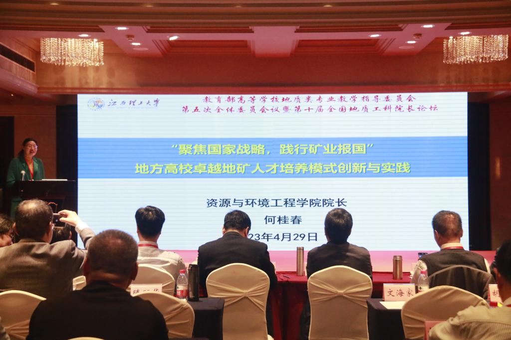 本网讯 4月28-30日,由教育部高等学校地质类专业教学指导委员会和全国地质工科院长论坛秘书处主办、江西理工大学和东华理工大学共同承办的“教育部高等学校地质类专业教学指导委员会第五次全体委员会议暨第十届全国地质工科院长论坛”在赣州顺利召开。教育部高等学校地质类专业教学指导委员会主任委员唐辉明、副主任委员刘玉强、秘书长夏庆霖,东华理工大学党委副书记、校长孙占学、党委常委、副校长夏菲,长安大学党委常委、副校长范文,我校党委副书记、校长温和瑞、党委常委、副校长罗仙平等出席了会议,地质类专业教学指导委员会委员、中国地质教育研究分会、全国地质工科院长论坛秘书处成员及全国50余所高校地质工科院长、系主任及专业负责人180余人参加了会议。