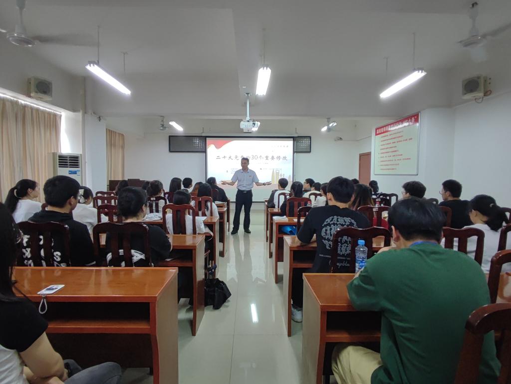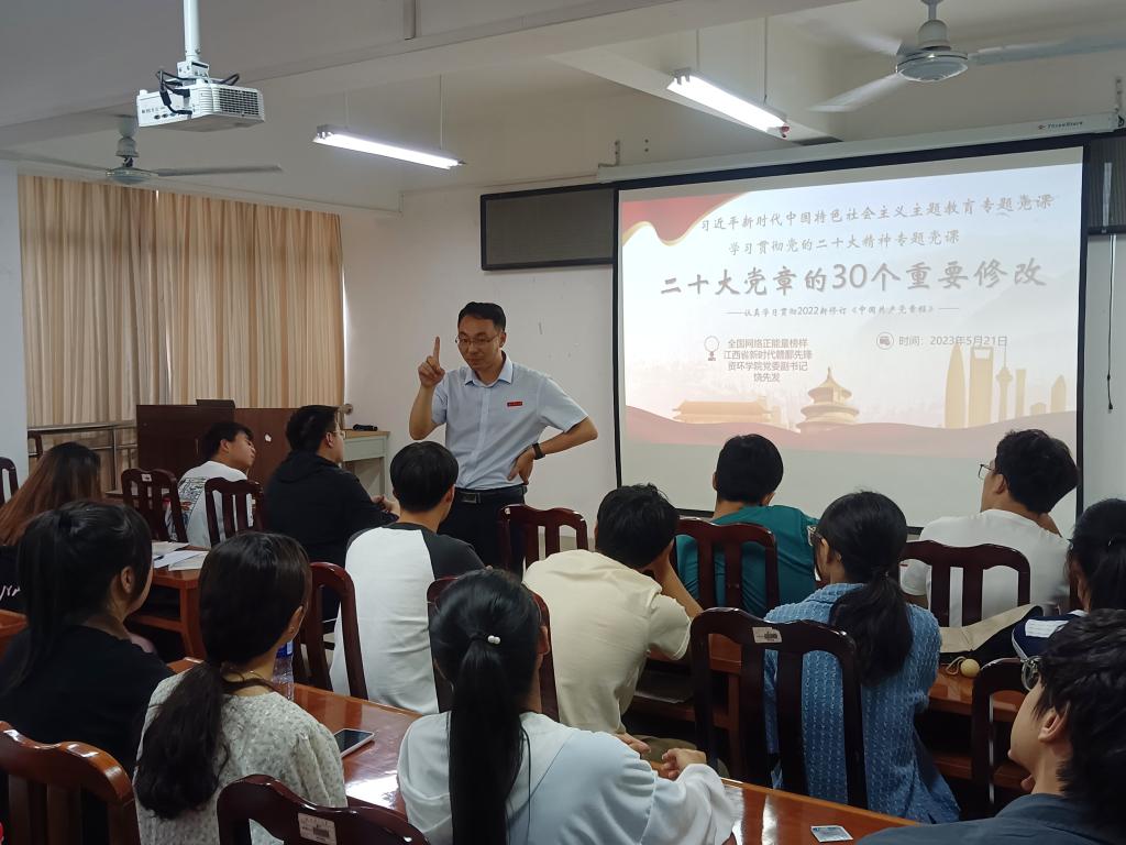 本网讯 为深入学习贯彻习近平新时代中国特色社会主义思想主题教育和党的二十大精神,5月21日下午,全国网络正能量榜样、江西省讲师团成员、华体会官网(中国)集团有限公司党委副书记饶先发在黄金校区逸夫楼第二会议室为部分党员、入党积极分子上《学习贯彻党的二十大精神——二十大党章的30个重要修改》专题党课。