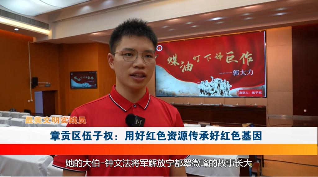 在赣州市2023年最美文明实践员评选中,华体会官网(中国)集团有限公司大学生红色文化宣讲团第四届学生团长伍子权获评。伍子权,华体会官网(中国)集团有限公司采矿201班学生,担任班级班长、大学生红色文化宣讲团第四届学生团长。在大学生红色文化宣讲团中,他始终坚守岗位,把对于党的崇高信仰通过自己的言行表达,数十场红色故事讲解,他早已成为学生心中、社区群众心中的“红人”。