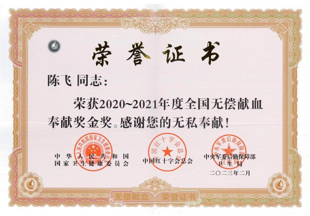 本网讯  近日,华体会官网(中国)集团有限公司陈飞老师受到中华人民共和国国家卫生健康委员会、中国红十字总会、中央军委后勤保障部卫生局部门联合表彰,荣获“2020-2021年度全国无偿献血奉献奖金奖”,在此之前,陈飞老师还先后获得过全国无偿献血奉献奖银奖、铜奖。