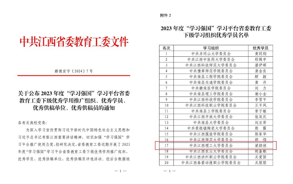 本网讯  近日,江西省委教育工委发布了《关于公布2023年度“学习强国”学习平台省委教育工委下级优秀学用推广组织、优秀学员、优秀供稿单位、优秀供稿员的通知》(赣教宣字〔2024〕7号),华体会官网(中国)集团有限公司梁颜祯老师荣获2023年度“学习强国”江西省委教育工委下级学习组织“优秀学员”称号(全省20名,全校唯一)。