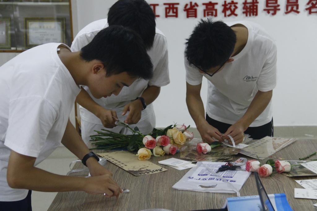 当天一大早,学生会的同学们分工明确,一部分同学们提前在贺卡上写好了自己对老师的感激语和祝福语;另外一部分学生则早已买好鲜花,在集齐所有贺卡后,开始了包装。每个人各司其职,尽心尽力的准备着活动所需物品。看着满桌的鲜花,同学们早已按耐不住,纷纷拿上鲜花为逸夫楼、教室里的老师们送上真挚的祝福。